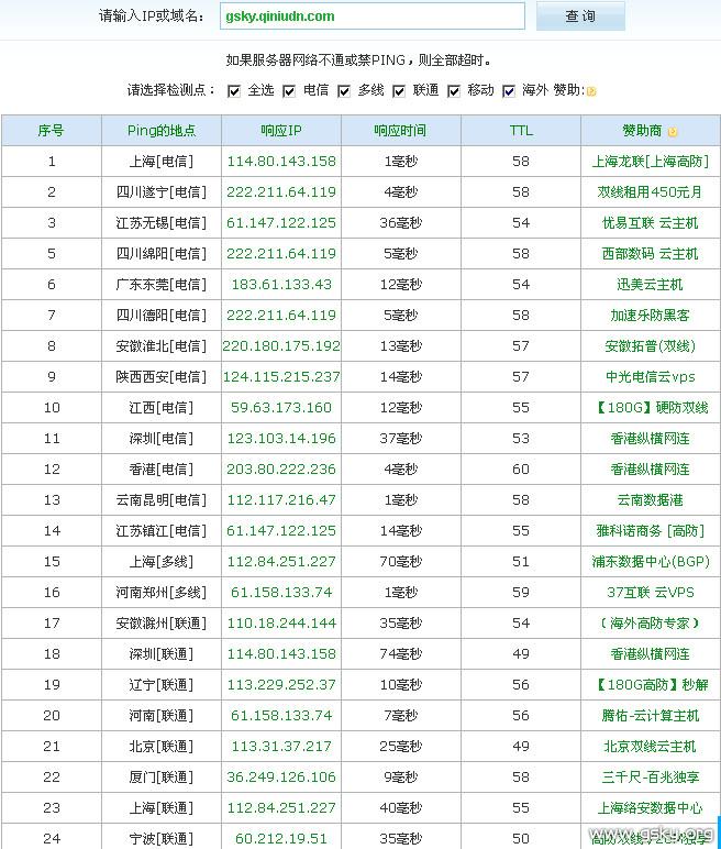 最快:上海[电信] 1 毫秒 最慢:美国洛杉矶[海外] 387 毫秒