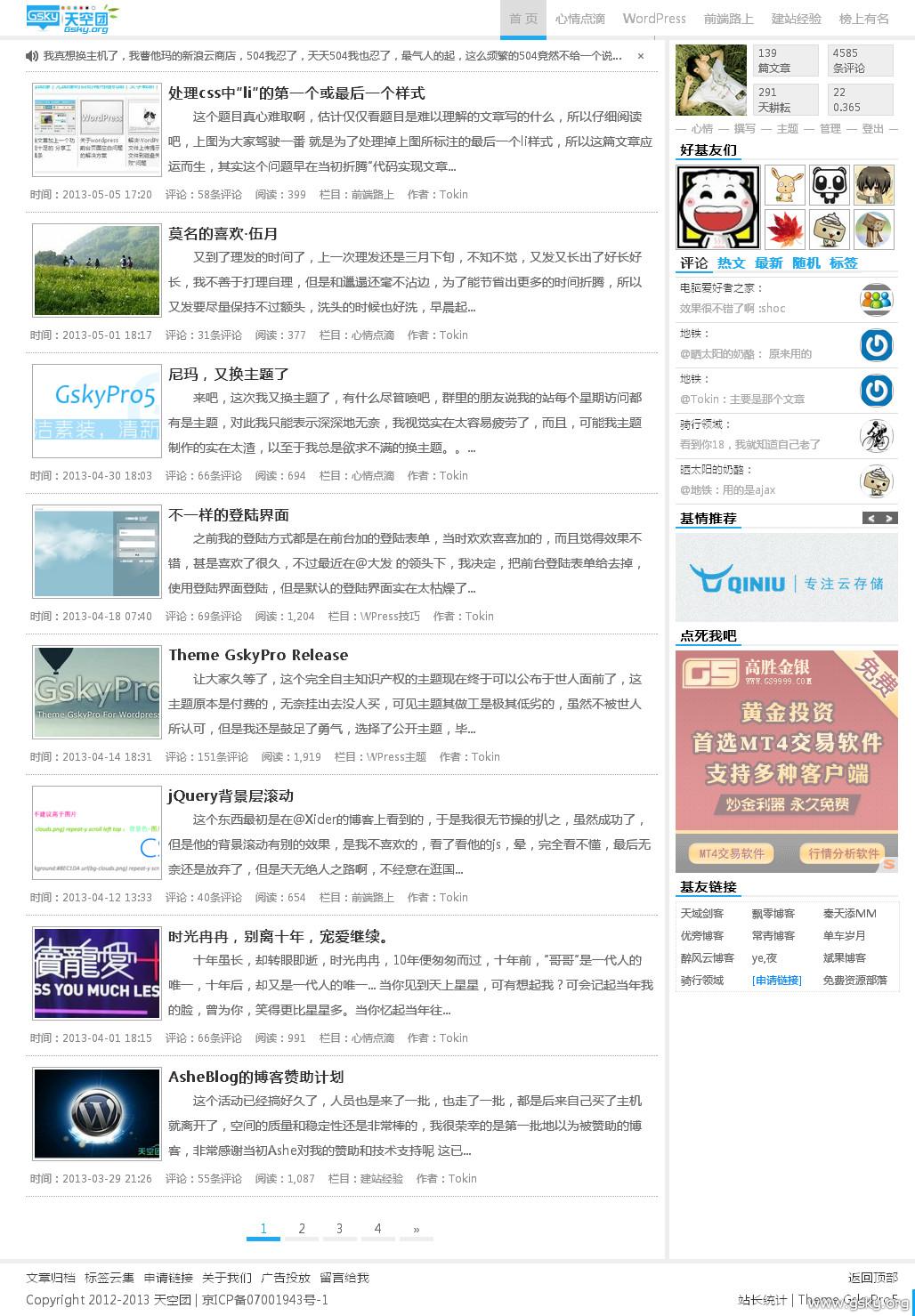 白色是主色调,灰色和蓝色是辅色,整款主题还算清新,使用主题完全不需要任何插件,相关文章什么的都包含在主题里面了,广告位有三个,都是250*250的大小