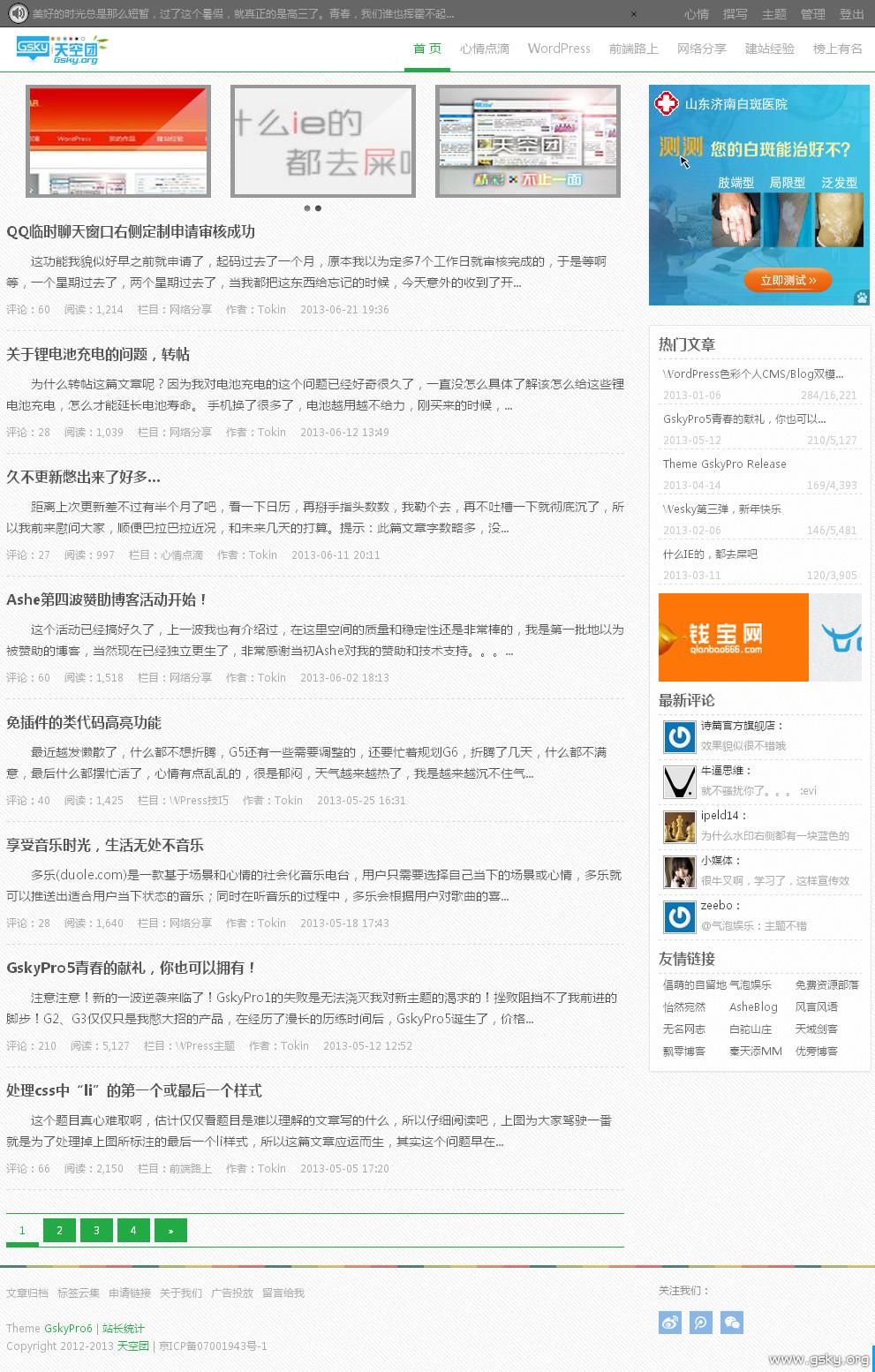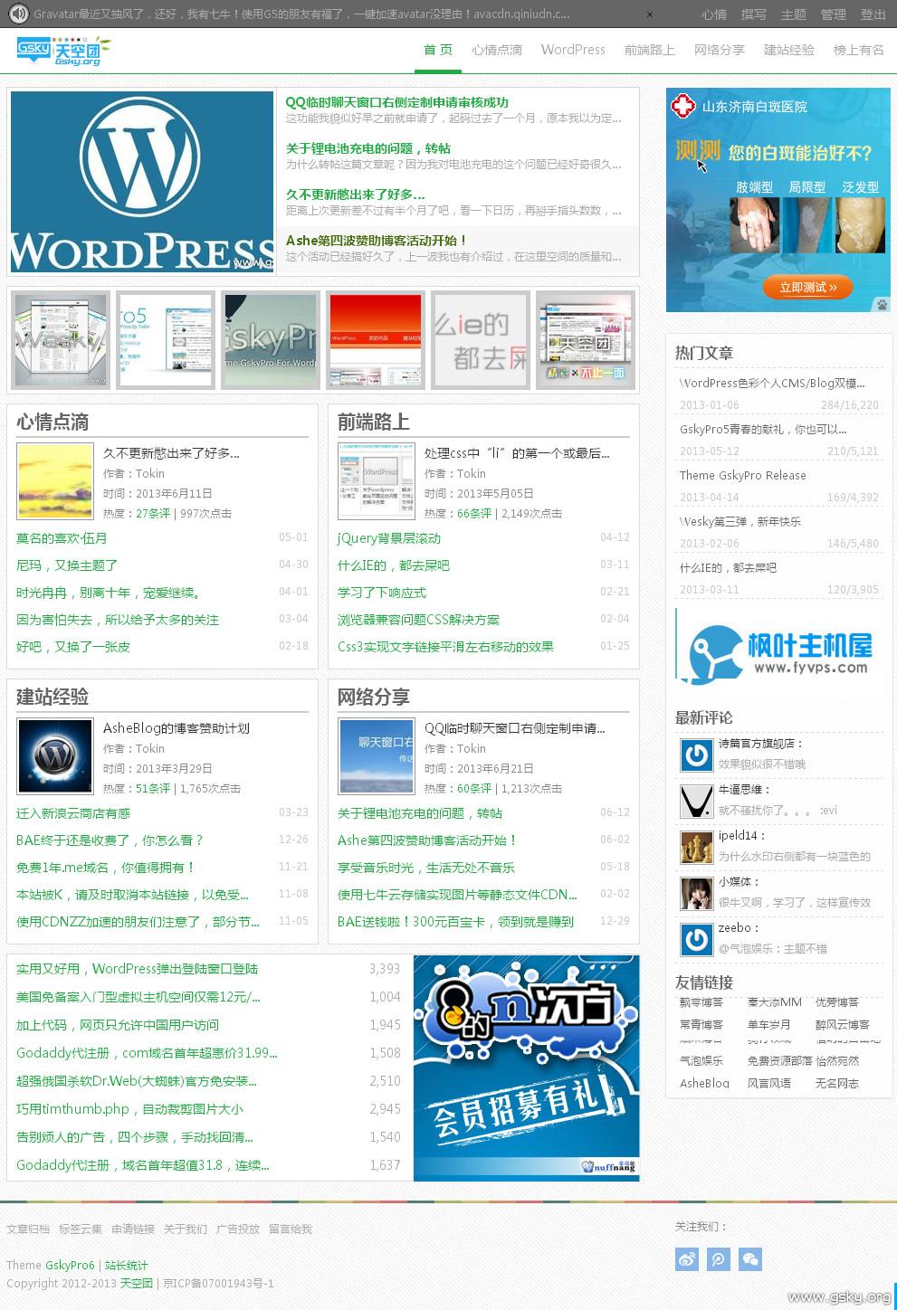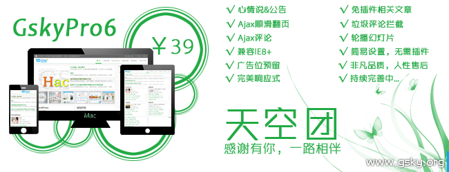 销声匿迹已经一月有余了,看看日历,天空团马上就要迎来自创立以来的一周年了,时间可真快,去年这个时候还在网络中苦苦挣扎,对博客什么的还不慎了解,到现在已经小有成就,想想都觉得有些不可思议,1周年了,本想来一些现金活动,无奈囊中羞涩,实在无力,只好折腾主题以表谢意,于是GskyPro6诞生了。