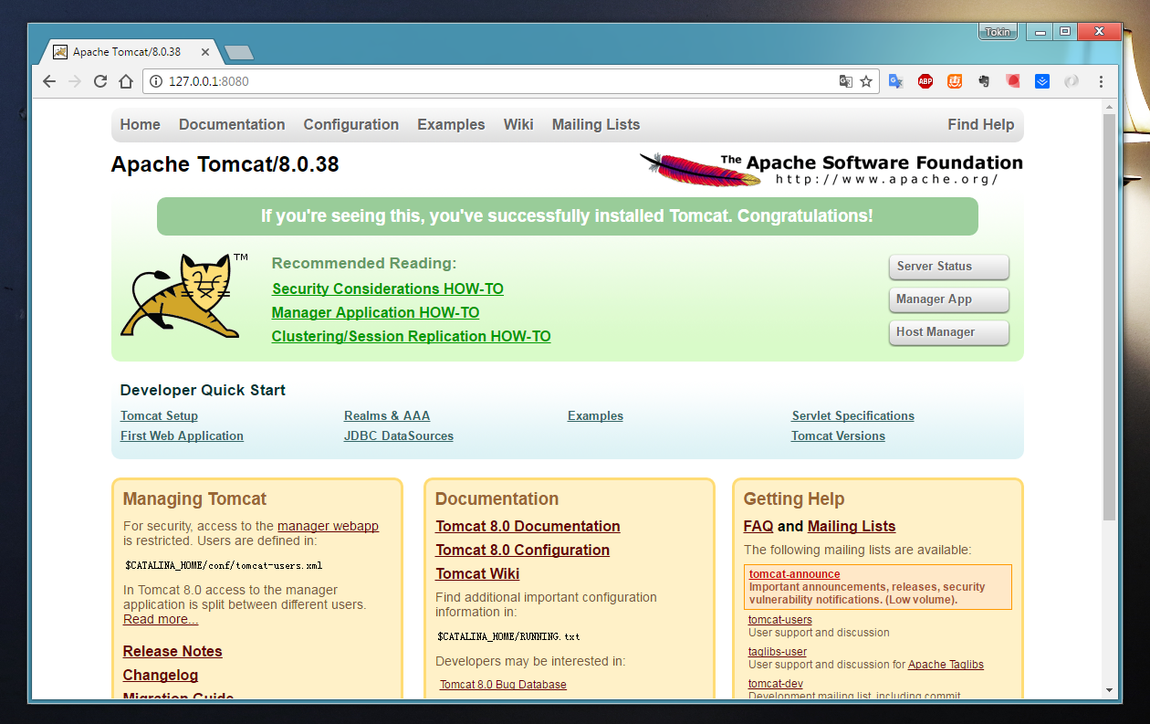 完成设置后,输入地址http://127.0.0.1:8080 就可看到 Tomcat 的管理页面。